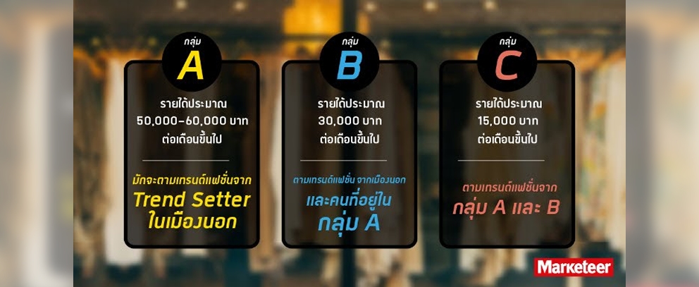 กลุ่ม A : รายได้ประมาณ 50,000-60,000 บาท / เดือนขึ้นไป มักจะตามเทรนด์แฟชั่นจาก Trend Setter ในเมืองนอก