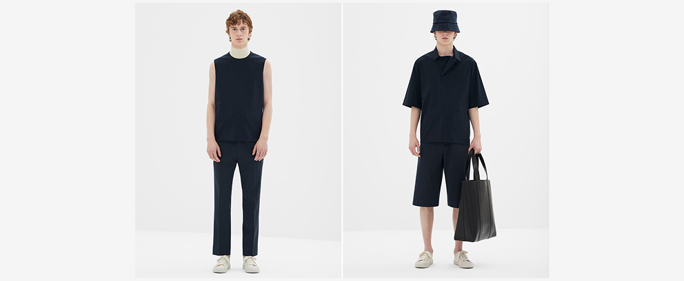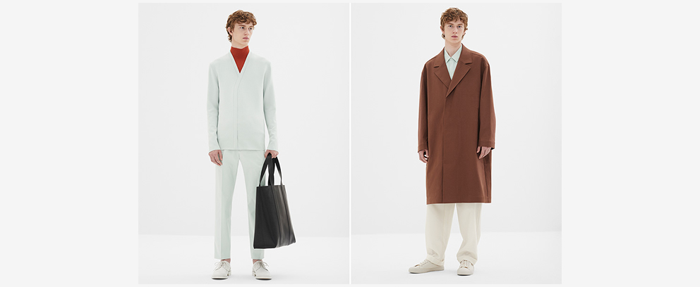 การเล่นกับวอลุ่มที่แตกต่างกันในเสื้อผ้าสำหรับบุรุษนั้นเห็นได้จากการจับคู่ระหว่างแจ็กเก็ตทรงหลวมกับกางเกงทรงแคบ ส่วนกางเกงผ้าวูลที่ดูแข็งก็นำมาใส่กับเสื้อโค้ทที่ดูเบาสบาย เป็นจุดกึ่งกลางระหว่างเสื้อสูทแบบซิงเกิ้ลเบรสท์และดับเบิลเบรสท์ หมวกทรงบัคเก็ตออกแบบให้ดูยาวขึ้น และพลิมโซลได้ออกแบบใหม่โดยใช้ผ้าใบและผูกเชือก โทนสีขาวดำ