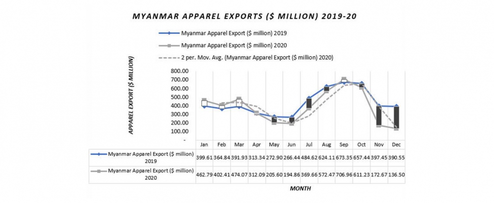 เมียนมาเป็นประเทศที่ตลาดเครื่องนุ่งห่มมีการเติบโตทางเศรษฐกิจสูงประเทศหนึ่ง เหตุการณ์รัฐประหารเป็นการซ้ำเติมให้การส่งออกลดลง ในปี 2563 การส่งออกเครื่องนุ่งห่มของเมียนมามีมูลค่า 4,621.31 ล้านเหรียญสหรัฐ หดตัวลงร้อยละ 11.75 เมื่อเทียบกับปี 2562 ที่มีมูลค่าการส่งออก 5,236.58 ล้านเหรียญสหรัฐ เนื่องจากสถานการณ์การแพร่ระบาดของเชื้อโควิด-19