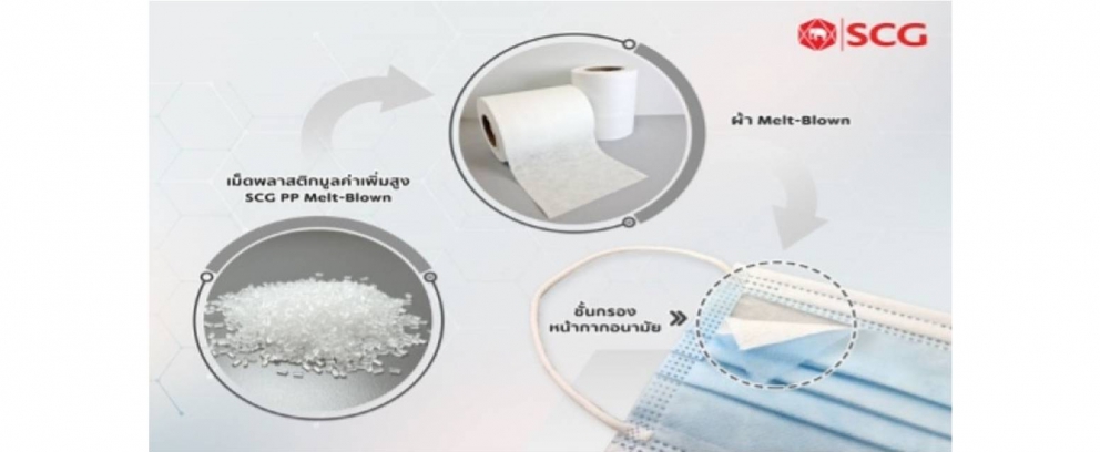 เม็ดพลาสติก SCG PP Melt-Blown ผ่านการทดสอบโดยสถาบันชั้นนำ ขณะนี้กำลังพัฒนาเป็นผ้าเมลต์โบลนร่วมกับผู้ผลิตในอุตสาหกรรมการแพทย์ เพื่อตอบโจทย์ความต้องการของบุคลากรทางการแพทย์ และผู้บริโภคที่มีวิถีชีวิตแบบ New Normal ใส่ใจสุขอนามัยของตนเองมากขึ้น สวมใส่หน้ากากอนามัยเป็นประจำเพื่อป้องกันเชื้อโรค รวมถึงฝุ่นละอองขนาดเล็ก เป็นต้น