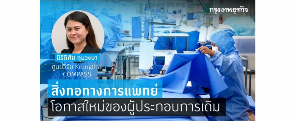 Krungthai COMPASS จึงมองว่าผู้ประกอบการไทยที่ทำธุรกิจสิ่งทอเดิม สามารถเริ่มต้นคว้าโอกาสจากธุรกิจสิ่งทอทางการแพทย์นี้ได้จากการผลิตสินค้าที่ยังไม่ต้องลงทุนสูงมาก โดยเริ่มได้จากสินค้า 2 กลุ่ม ซึ่งทั้งหมดเป็นสินค้าที่ใช้ภายนอกร่างกาย ได้แก่ ผลิตภัณฑ์ที่ใช้เพื่อสุขอนามัย (Health and Wellness) เช่น ชุดกีฬาที่กันแบคทีเรีย ที่มีแนวโน้มเติบโต 8.0% ต่อปี ในช่วงปี 2020-2027 และผลิตภัณฑ์ที่ใช้เฉพาะทางการแพทย์ (Medical and Patient Care) เช่น ชุด PPE ที่มีแนวโน้มเติบโต 8.7% ต่อปี ซึ่งจำแนกได้อีก 2 กลุ่มย่อย คือ ผลิตภัณฑ์ที่ขึ้นรูปโดยไม่ต้องถักทอเส้นใย (Nonwoven) โดยลักษณะสินค้าเหมาะสำหรับการใช้งานทางการแพทย์แบบครั้งเดียวทิ้ง และผลิตภัณฑ์ที่ขึ้นรูปโดยถักทอมาจากเส้นใย (Woven) โดยลักษณะสินค้าเหมาะสำหรับการใช้งานบ่อยครั้ง สามารถซักแล้วนำกลับมาใช้ใหม่ได้ ขณะที่ ผลิตภัณฑ์สิ่งทอทางการแพทย์ที่ใช้ภายในร่างกาย เช่น เส้นเลือดเทียมหรือเอ็นเทียม อาจต้องใช้ระยะเวลาอีก 5-10 ปี เพื่อให้ผู้ประกอบการสั่งสมประสบการณ์และพัฒนาเทคโนโลยีขั้นสูงจึงจะไปต่อได้