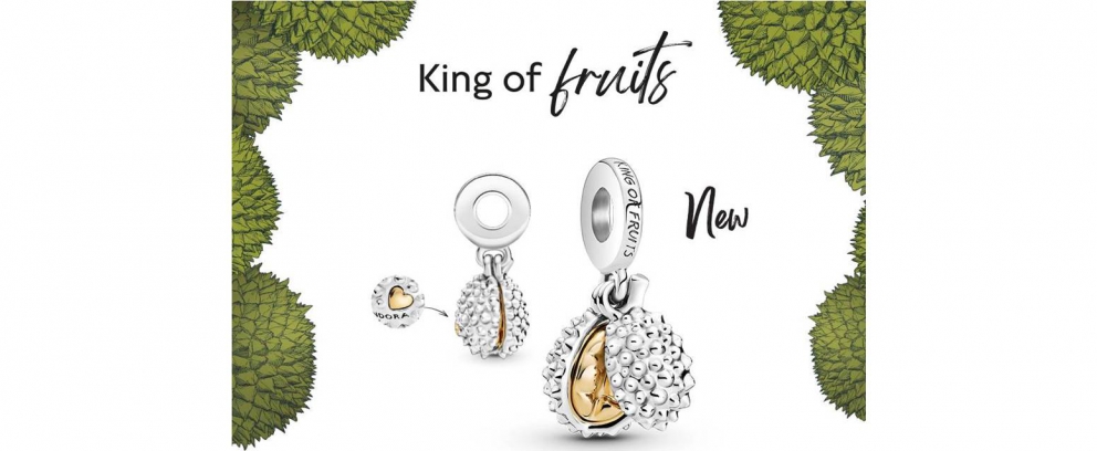 สำหรับ Durian Fruit Dangle Charm เป็นรูปทรงทุเรียนเต็มลูก ด้านนอกเป็นหนามทุเรียนทรงมน มีลูกเล่นเปิด-ปิดซ่อนพูทุเรียนสีทองไว้ด้านใน มาพร้อมกับตัวห้อยที่สลักคำว่า King of Fruit นอกจากนี้ด้านหลังยังมีหัวใจดวงเล็กสีทองพร้อมสลักคำว่า Pandora