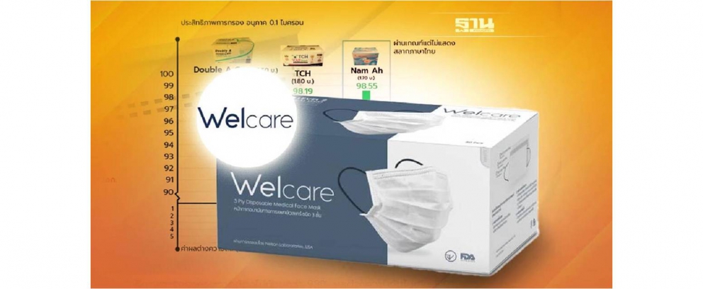 ซึ่งจากผลการทดสอบหน้ากากอนามัยระดับใช้งานด้านการแพทย์ทั่วไป (Medical Grade) และ ระดับใช้งานด้านการแพทย์ด้านศัลยกรรม (Surgical Grade) กำหนดให้หน้ากากอนามัยมีประสิทธิภาพการกรองอนุภาค ต้องไม่น้อยกว่าร้อยละ 98 ค่าผลต่างความดันไม่เกิน 5.0 mm H2O/cm2 พบว่า ยี่ห้อ Welcare : กรองอนุภาคขนาด 0.1 ไมครอน ได้ร้อยละ 96.91 มีค่าผลต่างความดัน 3.11 ราคา 2.50 บาท ซึ่งเป็นหนึ่ง 1 ใน 60 ยี่ห้อ ที่ระบุว่าได้รับมาตรฐาน มอก. 2424 - 2562