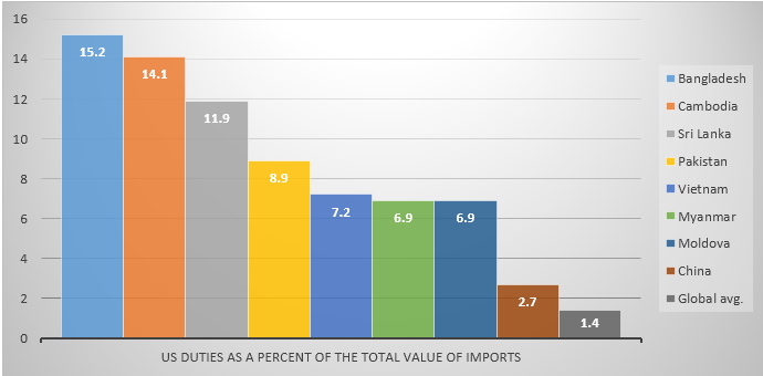 จากการสำรวจ พบว่า บังคลาเทศ กัมพูชา ศรีลังกา ปากีสถาน เวียดนาม และประเทศอื่นๆ ต้องเผชิญกับการเรียกเก็บภาษีนำเข้าเครื่องนุ่งห่มในอัตราที่สูง เนื่องจากประเทศเหล่านี้เป็นคู่แข่งทางการค้าที่สำคัญ สำหรับบังคลาเทศถูกเก็บภาษีอยู่ที่ ร้อยละ 15.2 ของมูลค่าการส่งออกทั้งหมดไปสหรัฐฯ ในขณะที่กัมพูชา ศรีลังกา ปากีสถาน และเวียดนาม จ่ายภาษีอยู่ที่ ร้อยละ 14.1 11.9 8.9 และ 7.2 ตามลำดับ