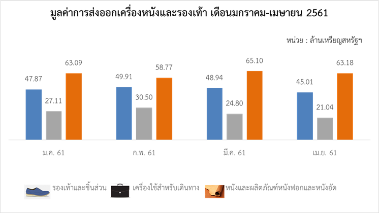 เมื่อพิจารณาการส่งออกสินค้าเครื่องหนังและรองเท้า สะสมสี่เดือน (มกราคม-เมษายน 2561) พบว่า รองเท้าและชิ้นส่วน มีมูลค่าการส่งออก 191.73 ล้านเหรียญสหรัฐฯ เพิ่มขึ้นร้อยละ 1.79 เมื่อเทียบกับช่วงเดียวกันของปีก่อน จากการส่งออกรองเท้าหนังและรองเท้าแตะ เพิ่มขึ้นร้อยละ 1.79 และ 10.88 ตามลำดับ เครื่องใช้สำหรับเดินทาง มีมูลค่าการส่งออก 103.45 ล้านเหรียญสหรัฐ เพิ่มขึ้นร้อยละ 17.23 เมื่อเทียบกับช่วงเดียวกันของปีก่อน จากการส่งออกกระเป๋าเดินทางและเครื่องเดินทางอื่นๆ เพิ่มขึ้นร้อยละ 38.81 และ 42.73 ตามลำดับ และหนังและผลิตภัณฑ์หนังฟอกและหนังอัด มีมูลค่าการส่งออก 250.14 ล้านเหรียญสหรัฐฯ เพิ่มขึ้นร้อยละ 14.95 เมื่อเทียบกับช่วงเดียวกันของปีก่อน จากการส่งออกหนังและผลิตภัณฑ์หนังอื่นๆ เพิ่มขึ้นร้อยละ 3.31