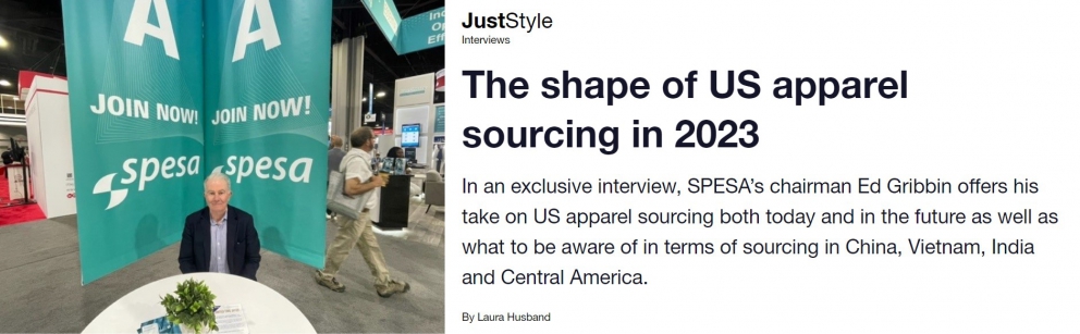 คุณ Ed Gribbin ประธาน SPESA ได้ให้สัมภาษณ์ในระหว่างการจัดงานแสดงสินค้า Texprocess Americas 2023 เกี่ยวกับการจัดหา (sourcing) สินค้าในกลุ่มเสื้อผ้าเครื่องแต่งกายของสหรัฐอเมริกาในปัจจุบันและคาดการณ์อนาคต และการตระหนักถึงการจัดหาในประเทศอื่น ๆ ทั้งจีน เวียดนาม อินเดีย และอเมริกากลาง