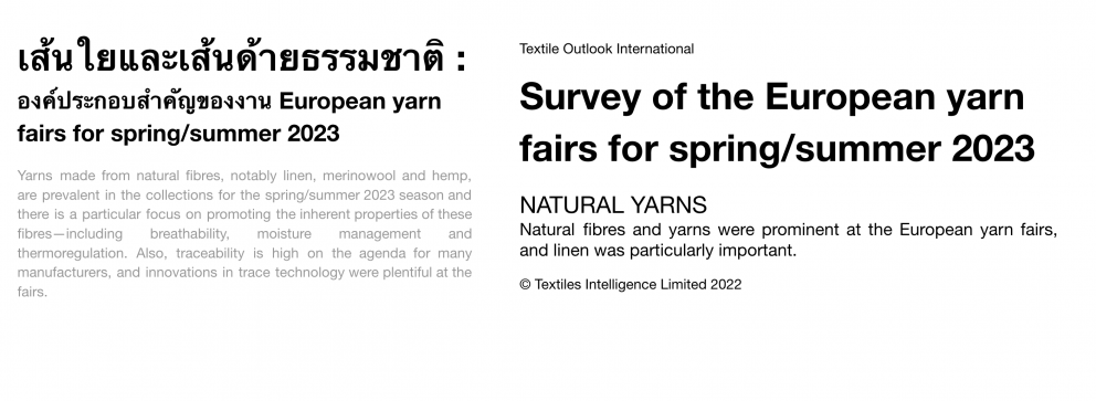 เส้นใยและเส้นด้ายธรรมชาติ เป็นองค์ประกอบที่สำคัญของงาน European yarn fair for spring/summer 2023 โดยเฉพาะลินินยังคงมีความสำคัญในงานคอลเลกชั่นเส้นด้ายของฤดูใบไม้ผลิ/ฤดูร้อน 2023 ทั้งนี้ ผู้แสดงสินค้าในงานแสดงสินค้าได้ใช้ประโยชน์จากคุณสมบัติการควบคุมอุณหภูมิ โดยธรรมชาติของเส้นใยลินินเหมาะสำหรับการใช้งานในฤดูใบไม้ผลิต/ฤดูร้อน เนื่องจากผ้าลินินสามารถระบายอากาศได้ดีเยี่ยมและการใช้ในเสื้อผ้าจะช่วยให้ไอน้ำและความร้อนส่วนเกินระบายออกจากร่างกายของผู้สวมใส่ได้เป็นอย่างดี