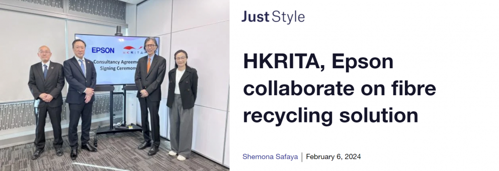 หน่วยงาน Hong Kong Research Institute of Textiles and Apparel Limited (HKRITA) ของฮ่องกง ได้ลงนามในข้อตกลงการพัฒนาร่วมกับ Seiko Epson Corporation (Epson) บริษัทเทคโนโลยีระดับโลก เพื่อสร้างโซลูชั่นในการรีไซเคิลเส้นใยแบบแห้งเชิงนวัตกรรม