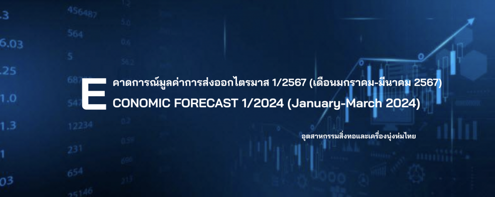 คาดการณ์มูลค่าการส่งออกของอุตสาหกรรมสิ่งทอและเครื่องนุ่งห่มไทยในไตรมาส 1 ปี 2567 จะขยายตัวเพิ่มขึ้นร้อยละ 1.2 เมื่อเทียบกับช่วงเดียวกันของปีก่อน (YoY) หรือที่มูลค่าคาดการณ์การส่งออกรวม 1,532.1 ล้านดอลลาร์สรัฐ จากสัญญาณการฟื้นตัวจากตลาดคู่ค้าสำคัญของไทยขยายตัว ได้แก่ สหรัฐอเมริกา ยุโรป จีน และ CLMV บวกกับอัตราเงินเฟ้อของประเทศคู่ค้ามีแนวโน้มชะลอตัว(1)
