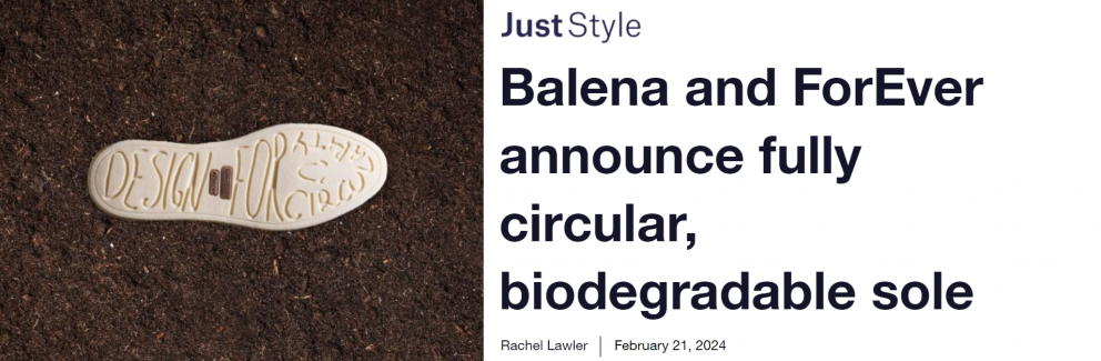 ForEver ผู้ผลิตพื้นรองเท้าของโปรตุเกส ร่วมมือกับ Balena บริษัทวัสดุศาสตร์ของอิตาลี ออกแบบและผลิตพื้นรองเท้าที่ย่อยสลายได้ทางชีวภาพได้อย่างสมบูรณ์