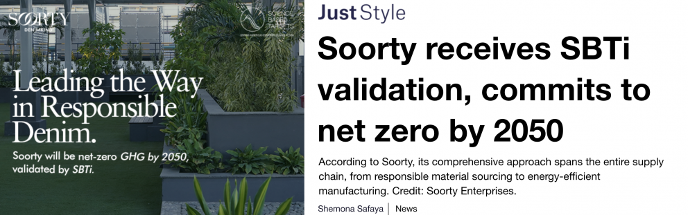 ผู้ผลิตเดนิมอย่างรับผิดชอบ หรือ ‘Soorty Enterprises’ อ้างว่าเป็นองค์กรแรกในปากีสถานที่ตั้งเป้าหมายลดการปล่อยก๊าซเรือนกระจกให้เป็นศูนย์ภายในปี 2050 โดยได้รับการยืนยันเป้าหมายการลดการปล่อยก๊าซในระยะสั้นจากโครงการ Science-Based Targets (SBTi)