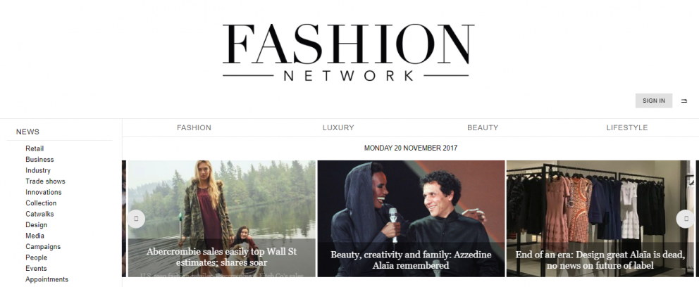 in.fashionnetwork.com เป็นเว็บไซด์ที่นำเสนอข้อมูล ข่าวสาร เกี่ยวกับแบรนด์แฟชั่น แฟชั่น ดีไซน์ และเทรนด์แฟชั่นทั่วโลก นอกจากนี้ยังมีแกลอรี่รูปภาพและคลิปวีดีโอ Fashion week และงานแสดงสินค้าทั่วโลก