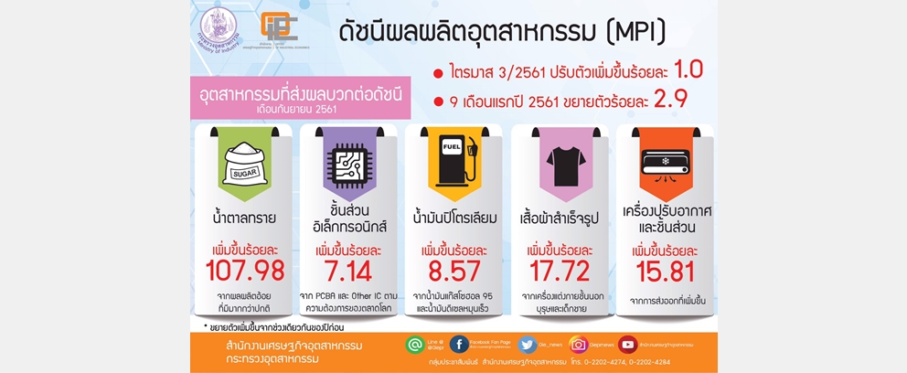 สำนักงานเศรษฐกิจอุตสาหกรรม (สศอ.) เผยดัชนีผลผลิตอุตสาหกรรม (MPI) เดือนกันยายน ลดลงร้อยละ 2.6 จากช่วงเดียวกันของปีก่อน ในขณะที่ไตรมาส 3/2561 ปรับตัวเพิ่มขึ้นร้อยละ 1.0 เมื่อเทียบกับไตรมาสเดียวกันของปีก่อน และในขณะที่ 9 เดือนแรกยังคงขยายตัวร้อยละ 2.9 ขณะที่อุตสาหกรรมที่ส่งผลบวกคือ น้ำตาลทราย ชิ้นส่วนอิเล็กทรอนิกส์ น้ำมันปิโตรเลียม เสื้อผ้าสำเร็จรูป และเครื่องปรับอากาศยังส่งผลบวก