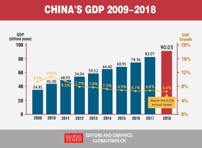 ทั้งนี้ ตัวเลขดังกล่าวเมื่อคำนวณรวมอัตราการเติบโตทางเศรษฐกิจของประเทศตลอดทั้งปีที่แล้วปรากฏว่าขยายตัวที่ระดับ 6.6% ลดลง 0.1% จากสถิติของปี 2560 ซึ่งจีดีพีเติบโตที่ระดับ 6.7% ขณะเดียวกันยังถือเป็นการชะลอตัวของจีดีพีมากที่สุดนับตั้งแต่ปี 2533 ซึ่งเศรษฐกิจของจีนในตอนนั้นขยายตัวที่ระดับเพียง 3.9% โดยผู้เชี่ยวชาญวิเคราะห์ว่าเป็นสืบเนื่องจากเหตุการณ์ความไม่สงบและความรุนแรงทางการเมืองที่จัตุรัสเทียนอันเหมินซึ่งเกิดขึ้น 1 ปีก่อนหน้านั้น