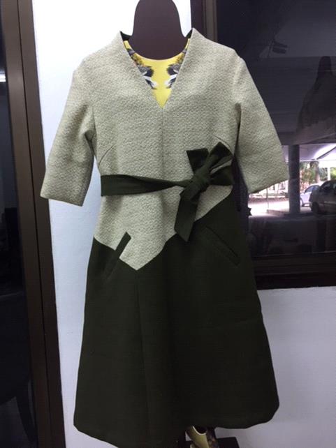 แนวความคิดในการออกแบบ/ Concept : การออกแบบเส้นและรูปทรงแบบกราฟิก ตัดต่อลายผ้าเป็นแนวที่ไม่เท่ากัน (อสมมาตร) เลือกใช้ผ้าฝ้ายสีเข้มตัดต่อเข้ากับผ้าฝ้ายสีอ่อน เทคนิคการตัดเย็บเพื่อลวงสายตาให้เหมือนเป็นชุดคนละท่อน แต่แท้จริงแล้ว เป็นชุดเดียวกันทั้งตัว เพื่อให้สวมใส่ง่ายไม่จำเป็นต้องแยกชิ้นเสื้อ และกระโปรง