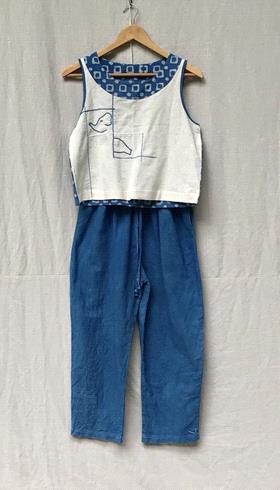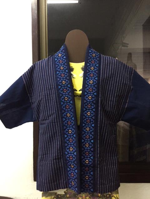 แนวความคิดในการออกแบบ/ Concept : การนำผ้าครามเทคนิคมัดย้อมทำให้เกิดลายผ้าและนำผ้าจกทอมือมาประดับตกแต่งให้เป็นเสื้อที่ร่วมสมัย