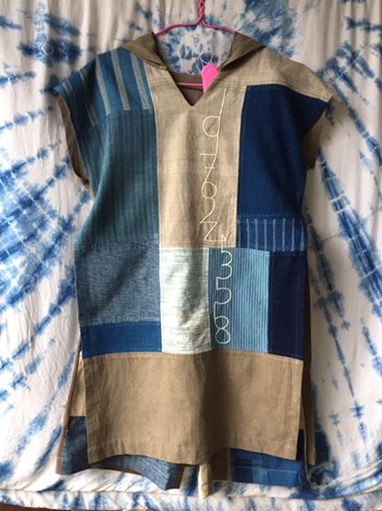 แนวความคิดในการออกแบบ/ Concept : การใช้เทคนิคการมัดย้อมผ้าเรยอนด้วยการพับทำให้เกิดลวดลาย แล้วมาตัดต่อโดยการย้อมด้วยหม้อห้อมธรรมชาติิ