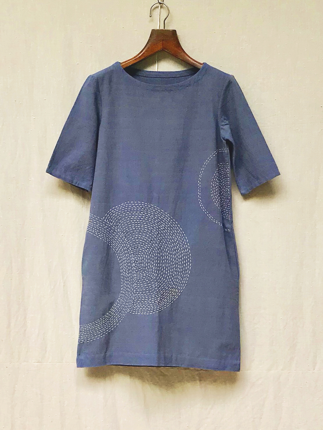 แนวความคิดในการออกแบบ/ Concept : การใช้ภูมิปัญญาดั่งเดิมการทอผ้าและการย้อมหม้อห้อม นำมาออกแบบชุดลำลองสตรีพร้อมปักลายดอกไม้ตกแต่ง