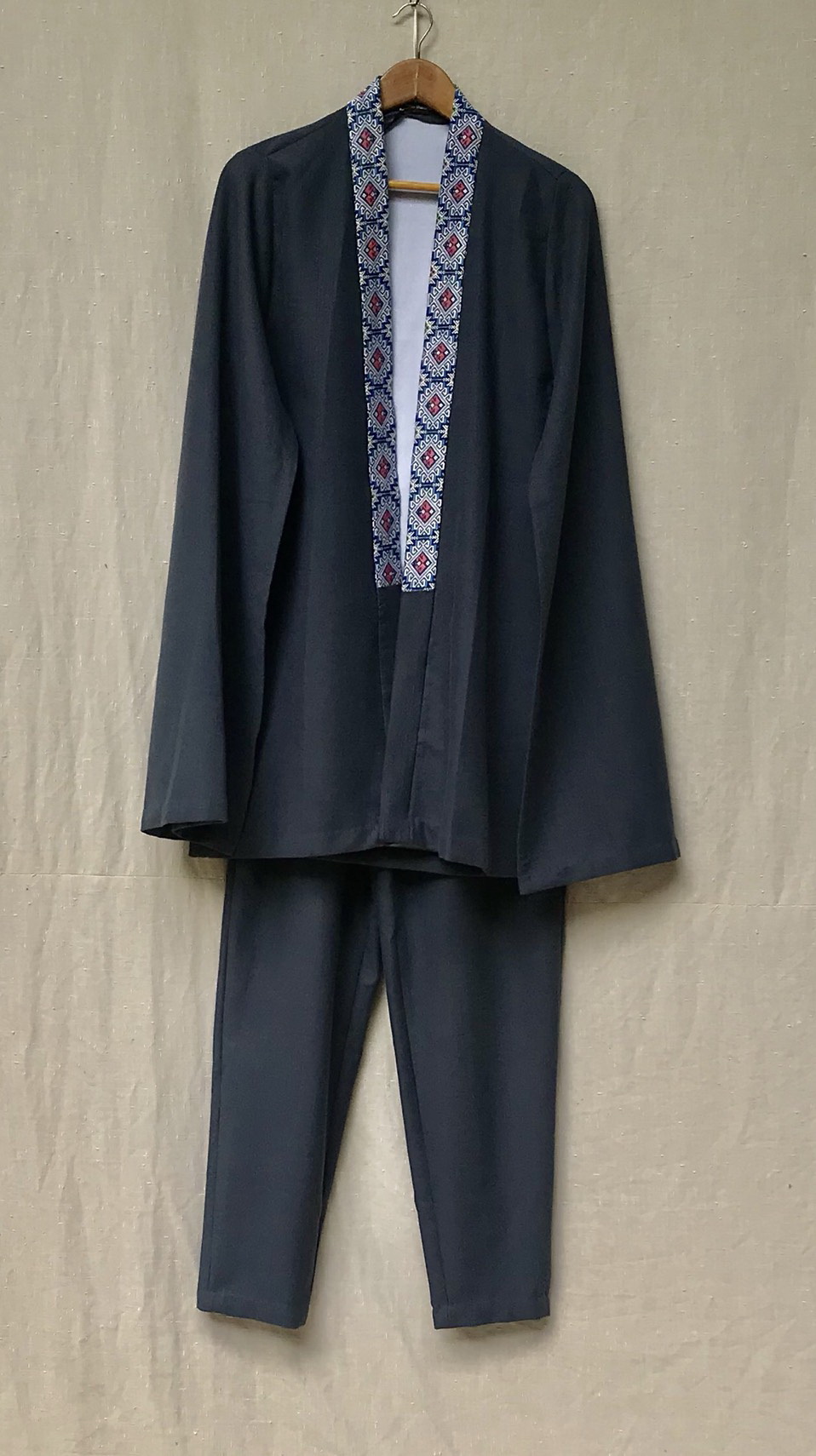 แนวความคิดในการออกแบบ/ Concept : การนำเศษผ้าหม้อห้อมเหลือใช้มาใช้ประโยชน์ นำมาตัดต่อลาย เกิดลวดลาย มาทำเสื้อผู้ชายแบบร่วมสมัยบนผ้าหม้อห้อมธรรมชาติ