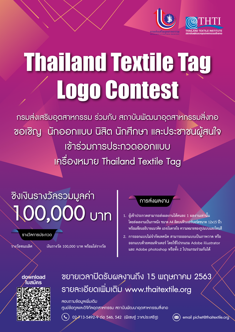 กรมส่งเสริมอุตสาหกรรม ร่วมกับ สถาบันพัฒนาอุตสาหกรรมสิ่งทอ ขอเชิญ นักออกแบบ นิสิต นักศึกษา และประชาชนผู้สนใจ เข้าร่วมการประกวดออกแบบเครื่องหมาย Thailand Textile Tag ชิงเงินรางวัลมูลค่า 100,000 บาท