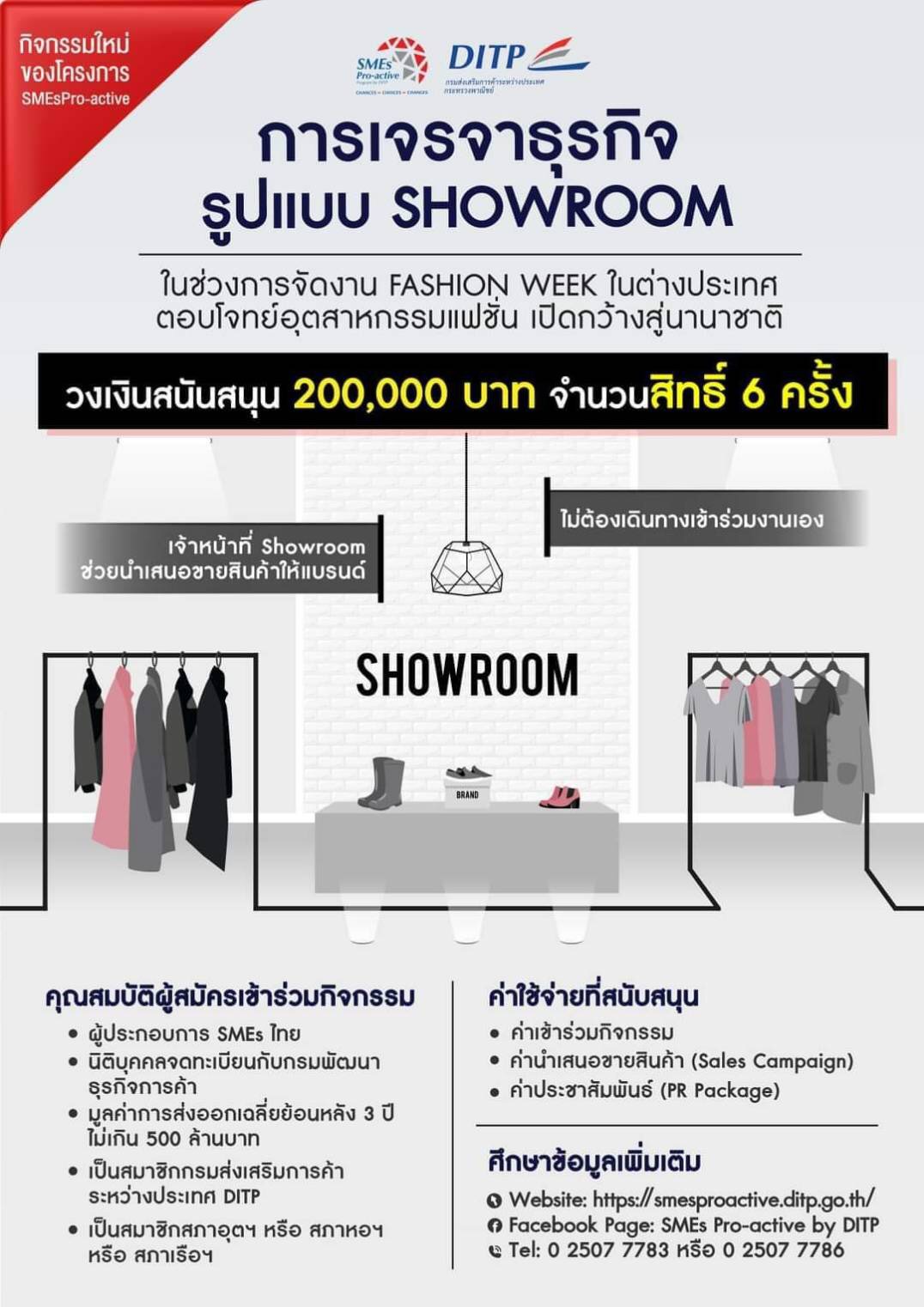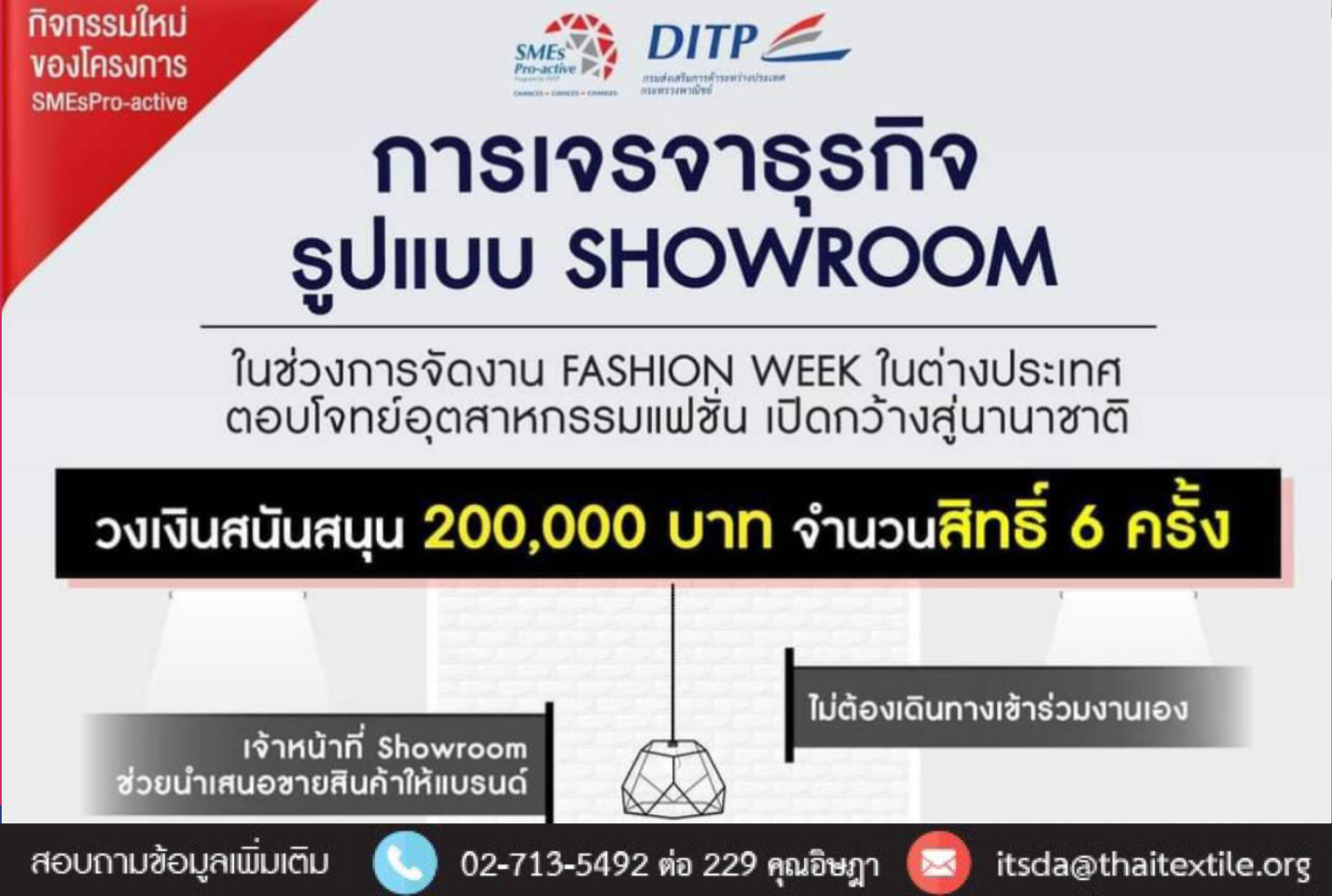 วมการเจรจาการค้า ส่วนกิจกรรมเจรจาธุรกิจในรูปแบบ Showroom ช่วงการจัดงาน Fashion Week ในต่างประเทศ เบิกจ่ายตามจริงได้ไม่เกิน 200,000 บาท 6 สิทธิ์ ค่าใช้จ่ายที่สนับสนุน ได้แก่ ค่าเข้าร่วมกิจกรรม ค่านำเสนอขายสินค้า และประชาสัมพันธ์