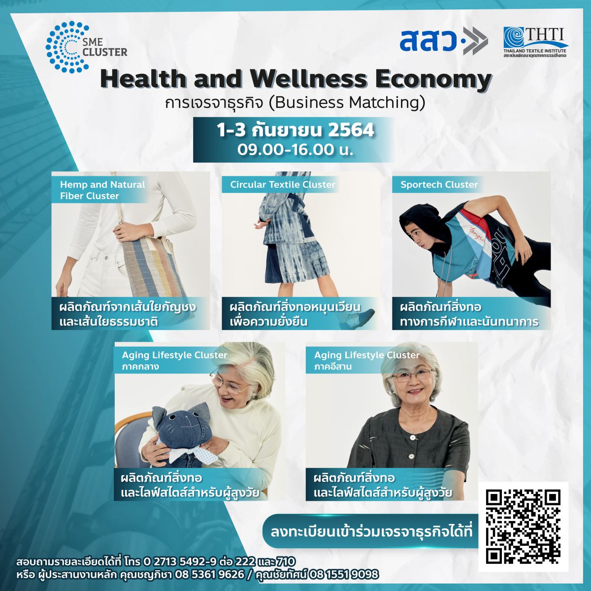 ผู้สนใจสามารถลงทะเบียนเข้าร่วมเจรจาธุรกิจได้ตั้งแต่บัดนี้ ที่ Facebook fanpage : Cluster Health and Wellness Economy by THTIFacebook fanpage : Thailand Textile Institute