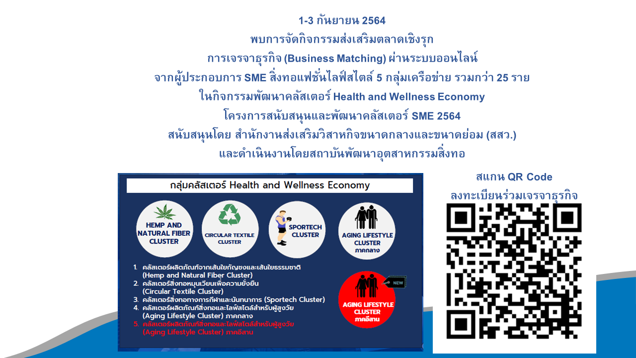 โดย ผู้สนใจที่จะเข้าร่วมโครงการ และมองหาพาร์ทเนอร์เริ่มต้นธุรกิจในกลุ่มอุตสาหกรรมสิ่งทอแฟชั่นและไลฟ์สไตล์ สามารถพบกับ การเปิดโอกาสการค้า เจรจาธุรกิจ ผ่านระบบออนไลน์จากผู้ประกอบการ SME กว่า 25 ราย ที่พร้อมเจรจาธุรกิจ ในกิจกรรมพัฒนาคลัสเตอร์ Health and Wellness Economy ภายใต้โครงการสนับสนุนและพัฒนาคลัสเตอร์ SME 2564
