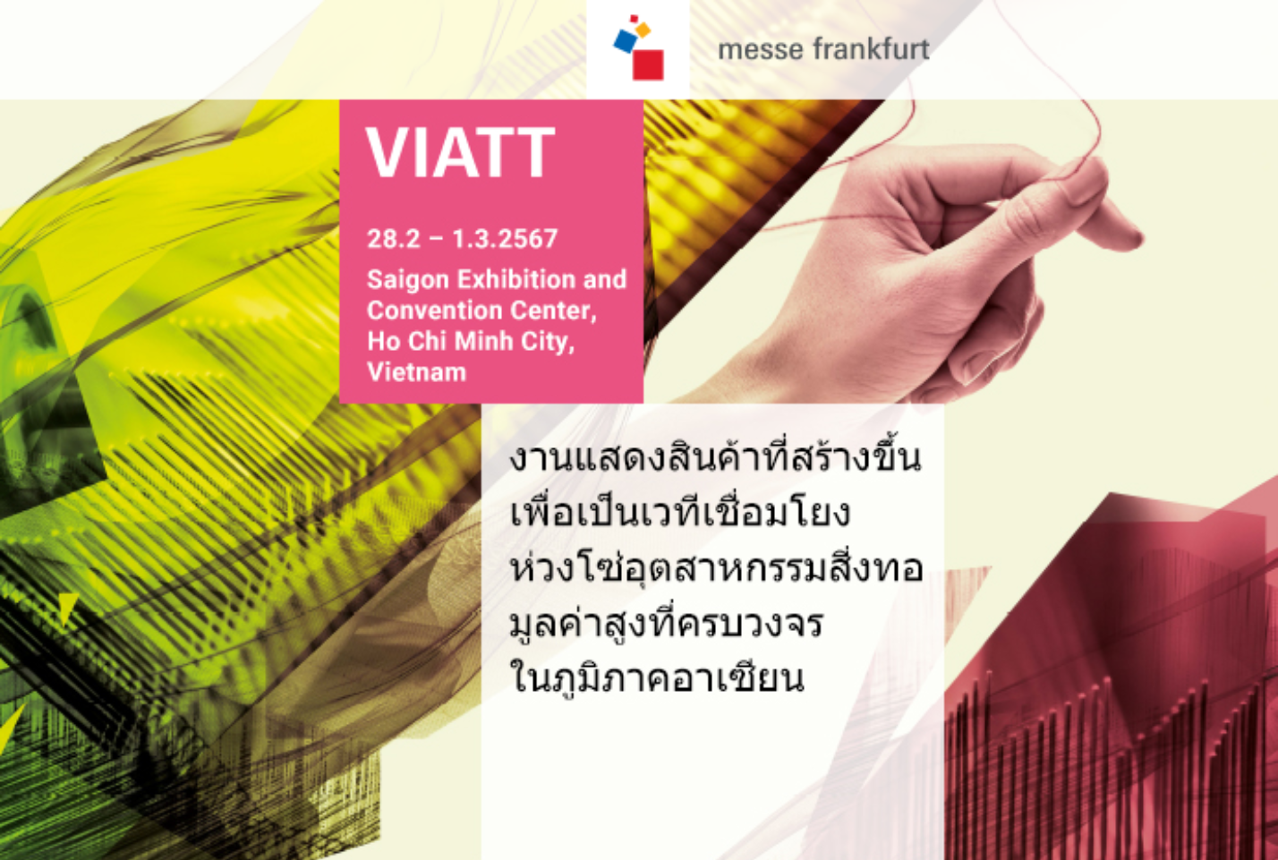 สถาบันพัฒนาอุตสาหกรรมสิ่งทอ ขอเชิญชวนผู้สนใจเข้าร่วมออกบูทงาน Vietnam International Trade Fair for Apparel, Textiles and Textile Technologies (VIATT) ซึ่งเป็นงานแสดงสินค้าเสื้อผ้า ผ้าผืน เส้นด้ายและเส้นใย ไปจนถึงเครื่องจักรสิ่งทอ Technical Textile, Nonwovens ที่ครบวงจร โดยจะจัดขึ้นระหว่างวันที 28 กุมภาพันธ์ ถึง 1 มีนาคม 2567 ณ Saigon Exhibition and Convention Center (SECC) สนใจขอรับใบสมัครที่ 02-7135492-9 ต่อ 222 , 081-7133449 (คุณปาจรีย์), pajaree@thaitextile.org หรือ สามารถอ่านรายละเอียดได้ที่นี่