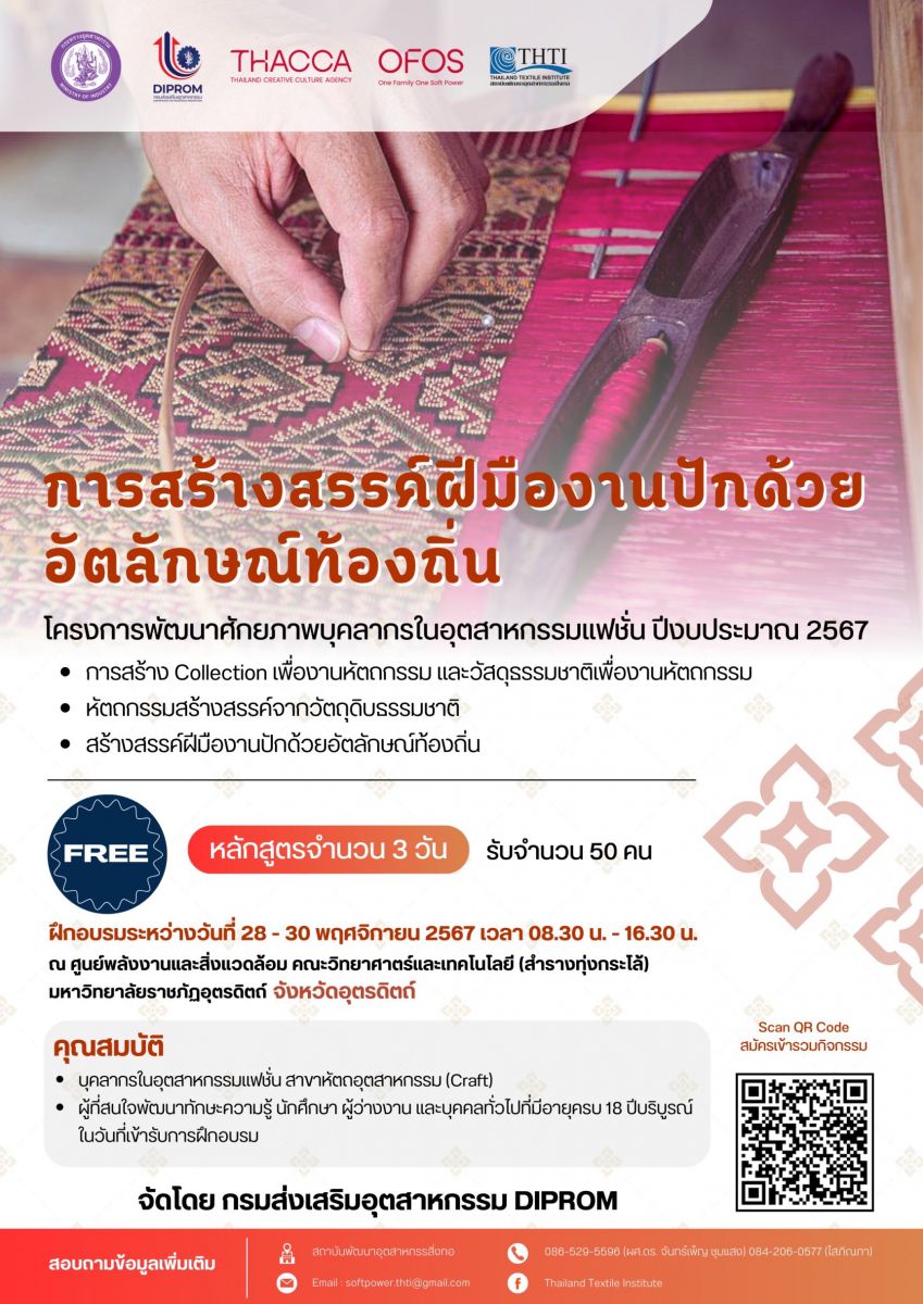 โครงการพัฒนาศักยภาพบุคลากรในอุตสาหกรรมแฟชั่น ปีงบประมาณ 2567 การสร้างสรรค์ฝีมืองานปักด้วยอัตลักษณ์ท้องถื่น 28 - 30 พ.ย. 2567