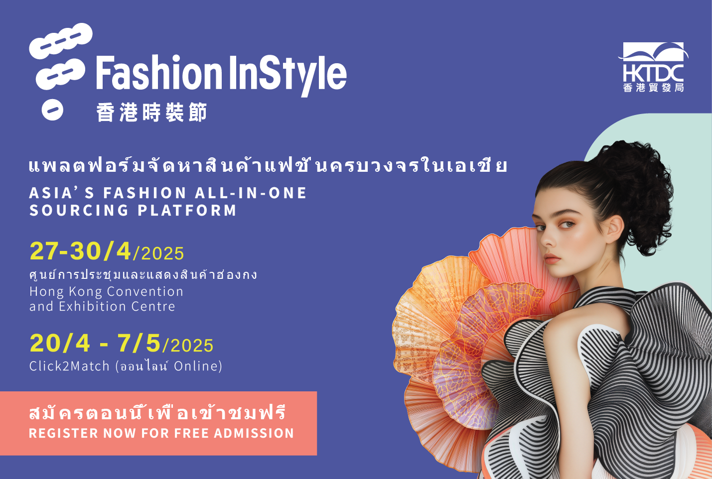 เตรียมพบกับงาน Fashion InStyle Hong Kong 2025ซึ่งจะจัดขึ้นในระหว่างวันที่ 20–23 เมษายน 2568 ณ ศูนย์ประชุมและแสดงสินค้าฮ่องกง (Hong Kong Convention and Exhibition Centre – HKCEC) งานแฟชั่นระดับแนวหน้าของเอเชียที่รวมสุดยอดนวัตกรรมแฟชั่น โอกาสทางธุรกิจ และการสร้างเครือข่ายอุตสาหกรรมไว้อย่างครบวงจร